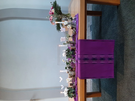 Vier kandelaars met kaarsen staan opgesteld. Tussen de eerste en tweede kandelaar zweven twee duiven, en tussen de derde en vierde kandelaar verschijnt een engel. Op de boomstammetjes en in de flesjes staan nu roze materialen. Het donker is doorbroken, het paars verzacht, een feestelijke kleur gloeit op. Drie kaarsen branden. De duiven en de engel zijn boodschappers van de Geest. Zij kondigen aan wat komt. De engel brengt vreugde, Johannes getuigt, geïnspireerd door de Geest spreekt hij van nieuw begin.